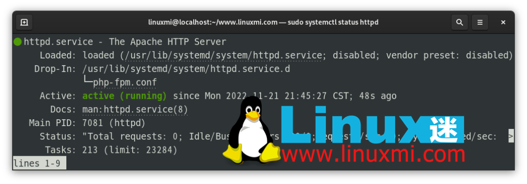 [linuxmi@localhost www.linuxmi.com]$ sudo systemctl status httpd