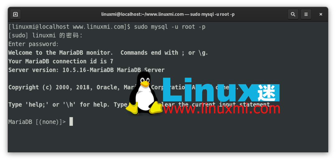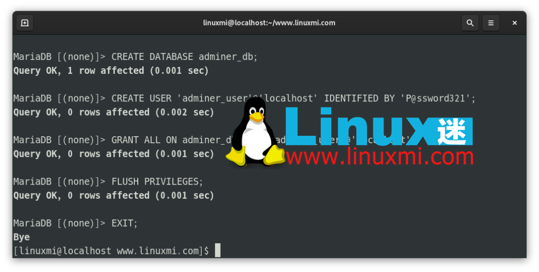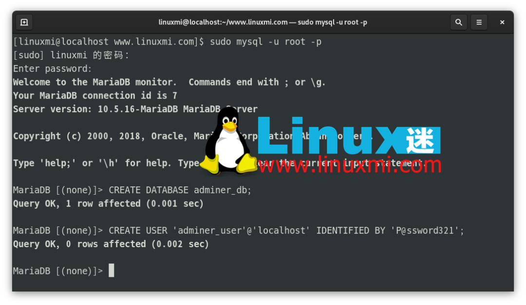 下一步是为 Adminer 创建数据库。因此,登录到数据库服务器。[linuxmi@localhost www.linuxmi.com]$ sudo mysql -u root -p
