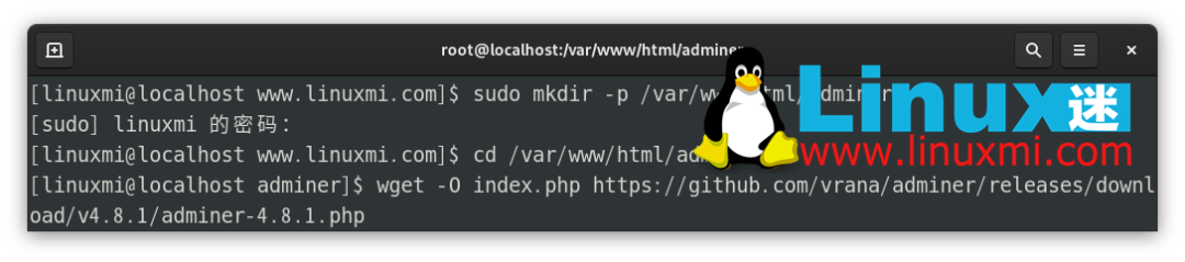 Adminer 数据库就位后,下一步是下载 Adminer 安装文件。但首先,您需要在文档根目录中为 Adminer 创建一个目录,如下所示。[linuxmi@localhost www.linuxmi.com]$ sudo mkdir -p /var/www/html/adminer