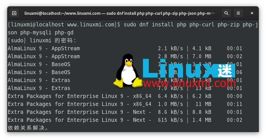 由于 Adminer 是从前端访问并由 PHP 提供支持的,因此我们需要安装 LAMP 堆栈。我们已经有了一个关于如何在基于 RHEL 的发行版上安装 LAMP 堆栈的综合指南。在 LAMP 堆栈就位后,继续并安装与Adminer 一起工作所需的其他PHP扩展。[linuxmi@localhost www.linuxmi.com]$ sudo dnf install php php-curl php-zip php-json php-mysqli php-gd