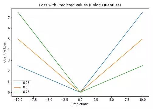 分位数损失(Y轴)与预测值(X轴)图示。Y的真值为0