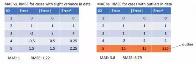 下面让我们观察MAE和RMSE(即MSE的平方根,同MAE在同一量级中)在两个例子中的计算结果。第一个例子中,预测值和真实值很接近,而且误差的方差也较小。第二个例子中,因为存在一个异常点,而导致误差非常大。