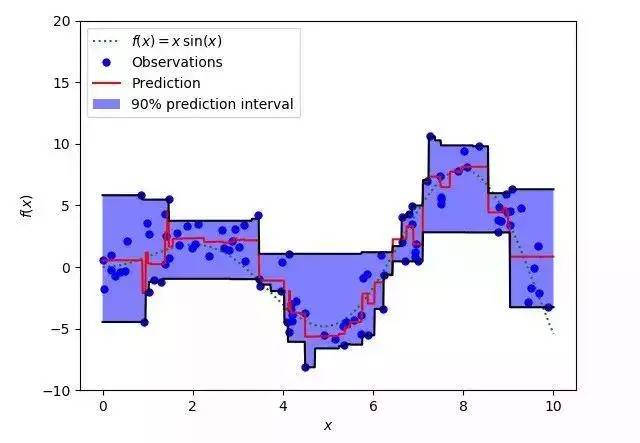 上图表明:在sklearn库的梯度提升回归中使用分位数损失可以得到90%的预测区间。其中上限为γ=0.95,下限为γ=0.05。