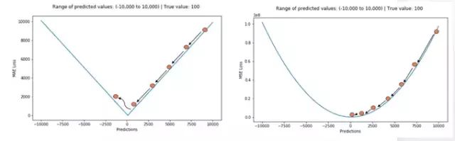使用MAE训练神经网络最大的一个问题就是不变的大梯度,这可能导致在使用梯度下降快要结束时,错过了最小点。而对于MSE,梯度会随着损失的减小而减小,使结果更加精确。