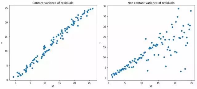 左:b/wX1和Y为线性关系。具有恒定的残差方差。