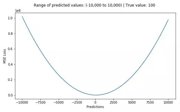 下图是MSE函数的图像,其中目标值是100,预测值的范围从-10000到10000,Y轴代表的MSE取值范围是从0到正无穷,并且在预测值为100处达到最小。