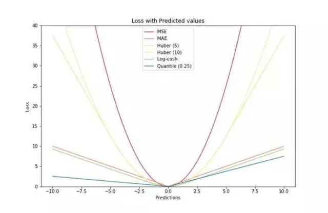 在这种情况下,Huber损失就非常有用。它会由于梯度的减小而落在最小值附近。比起MSE,它对异常点更加鲁棒。因此,Huber损失结合了MSE和MAE的优点。但是,Huber损失的问题是我们可能需要不断调整超参数delta。