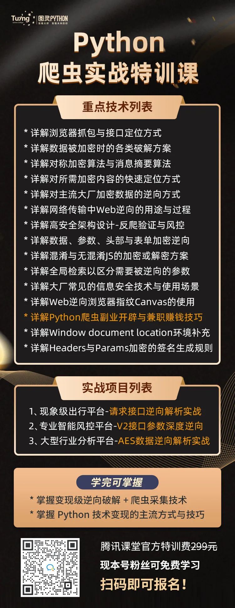 这是一套专讲爬虫与反爬虫攻防的实战特训课程,迄今为止已经帮助了超3W学员快速进阶!本次课程将由国际大数据竞赛获奖大佬亲身指导,带领大家进行一线前沿技术体系+多重逆向解析项目实战的综合技术速成训练!