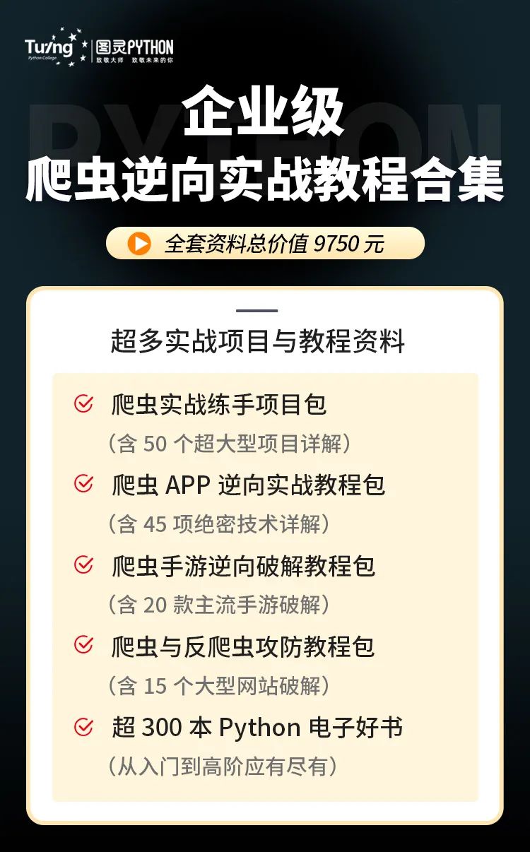 免费获得我耗时7个月精心整理的Python爬虫教程包一套!学完速成干货课程,要第一时间拿大厂高阶项目实战巩固,进一步提升技术,这套资料就非常适合练手!