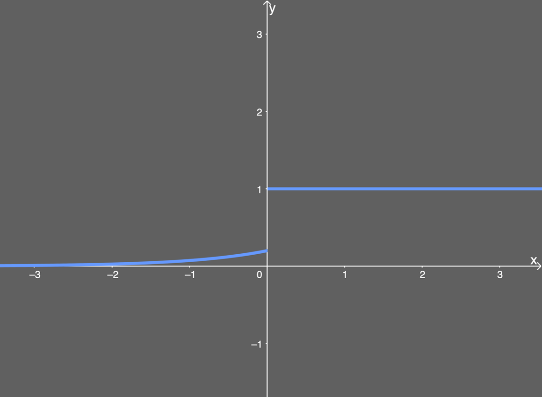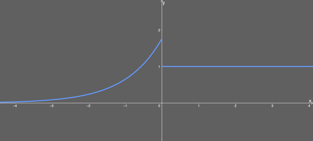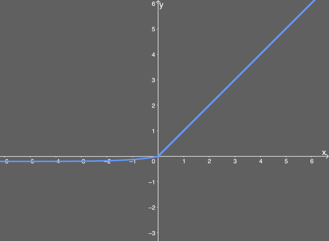 看起来很简单。如果输入 x 大于 0,则 y 值输出为 1;如果输入 x 小于或等于 0,则输出是 ELU 函数(未微分)加上 α 值。