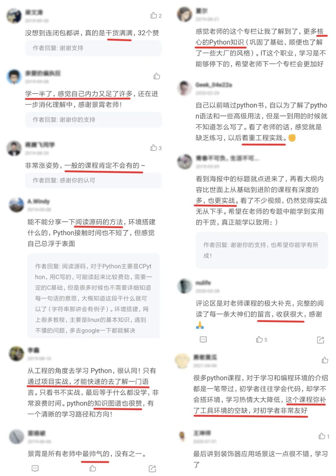 在留言区,你能看到各种各样的解题思路,有的你可能会意想不到,收获惊喜。每个人都针对课程的思考题或知识点,留言探讨,作者也能及时给予反馈和解答。像这样既有高手带路、还能有一群共同学习的人相伴,不可多得。