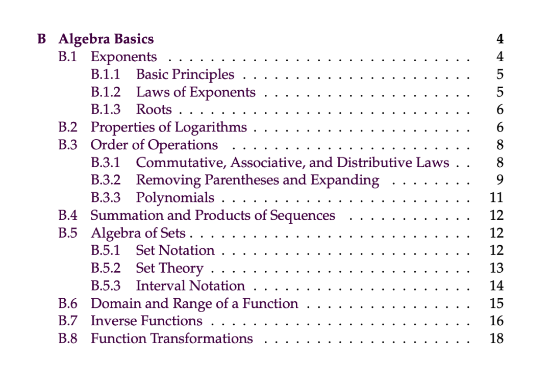 附录 B 中对与机器学习算法背后的数学相关的基本代数概念进行了回顾。代数是数学的一个分支领域,它使用数字和字母(或符号)来描述关系。代数经常被用来解决至少有一个量是未知的或可能变化的问题(通常称之为变量)。简单地说,我们可以把代数看作是一种结合了字母、符号和数字的语言,用来概括算术运算和解决带有变量的方程式。作者提示,虽然本附录的目的是让读者了解代数基础知识,但它并非一个全面的代数资源。如果你想更深入地学习代数,可以参考更全面的资源,比如 Tyler Wallace 的《初级和中级代数》。