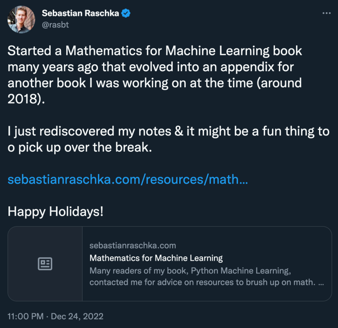 Sebastian Raschka 同样分享了写作这本书时的幕后故事,解释了「优先事项的转变」以及最终未出版《机器学习数学》的原因:最初,我倾向于写更多关于「数学」部分的文章,这对于几乎所有非数学专业的人来说都是一个真正的障碍。一开始我认为写一本关于「机器学习数学」的书是一件很酷的事情。现在,我有大约 15 章关于预微积分、微积分、线性代数、统计学和概率论的笔记。但是,我最终得出结论,已经有太多其他数学书籍了,其中的大多数比我撰写的 500 页内容介绍得更好、更全面、更准确。毕竟,我认为学习和理解一门学科的真正动机首先来自于对它的兴趣。