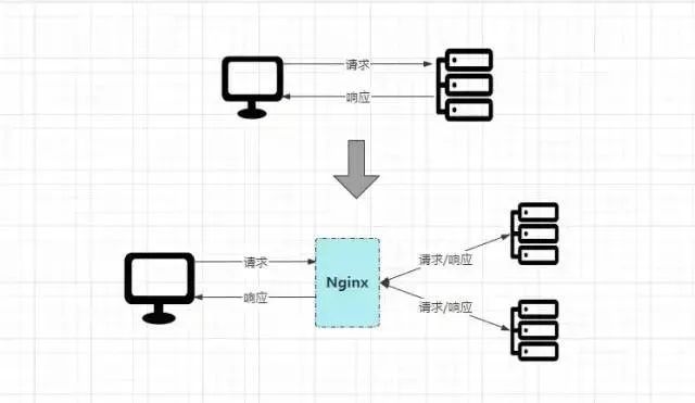 原本客户端是直接请求目标服务器,由目标服务器直接完成请求处理工作,但加入Nginx后,所有的请求会先经过Nginx,再由其进行分发到具体的服务器处理,处理完成后再返回Nginx,最后由Nginx将最终的响应结果返回给客户端。