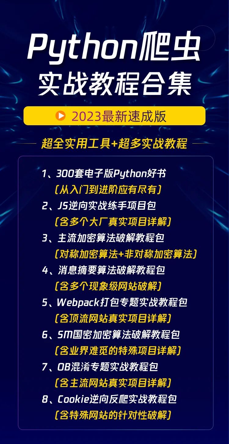 这是一套专讲爬虫逆向破解的高阶技术实战课,迄今为止已帮助近三万学员快速进阶。本次课程将由国际大数据竞赛获奖大佬亲身指导,带领大家进行一线大厂高阶技术体系+多重逆向解析项目实战+技术变现路径指导的综合速成训练!