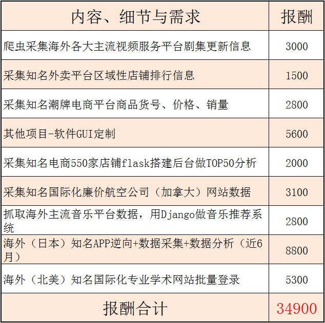 其实就目前来说,需求大、报酬高、合作稳定的Python私活项目,大多都是网络爬虫类的。通常一个4小时内能完成爬虫项目,其报酬不会少于1.5K。这里放一张近期的接单记录,现在订单很多,只要有足够的技术,做兼职赚点外快比较轻松。