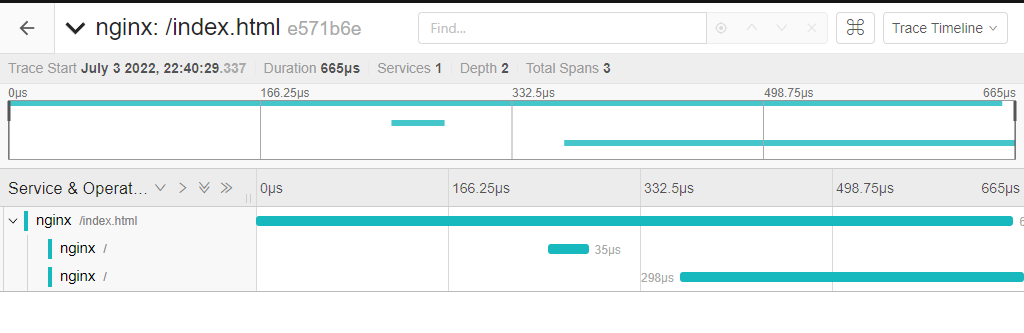 此时我们可以在 jaeger 上查看,可以看到 NGINX 的 span(因为这里只配置了 NGINX,没有配置更多的后端)。