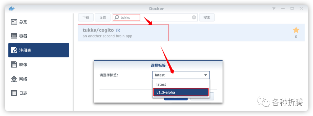 在注册表中搜索 tukks ,选择第一个 tukks/cogito,版本选择 latest。