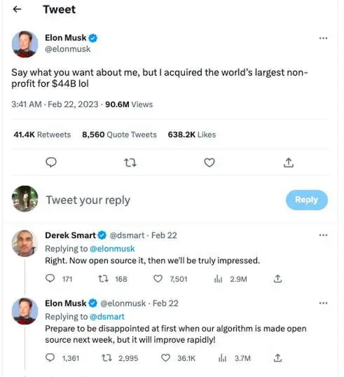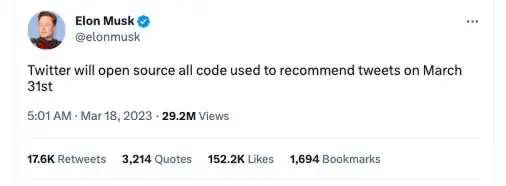 在此之前,马斯克其实在 2 月 22 日的时候就宣布过“Twitter 的算法将于一周后开源”。当时一位 Twitter 用户在与马斯克互动时表示,把 Twitter 开源吧,如果能够做到这一点,他们“真的会印象深刻”。马斯克随后回复称:“我们的算法会在下周开源,首先要做好失望的准备,但它会迅速改进的!”