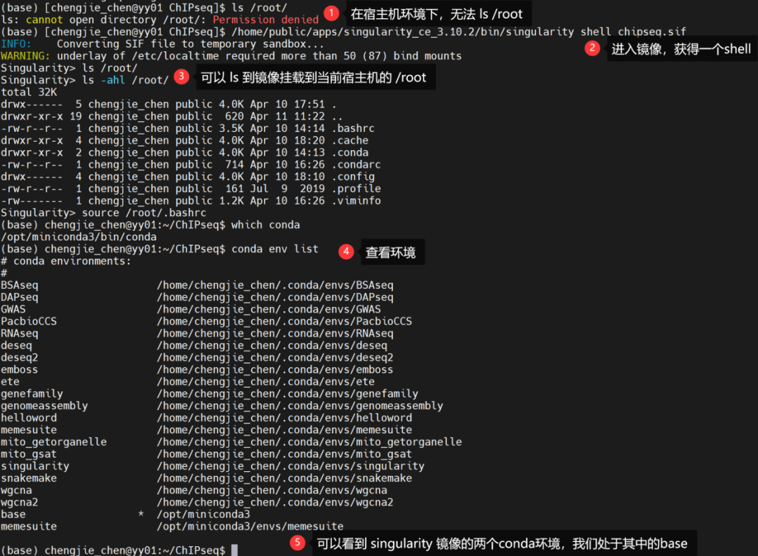 2022年暑期培训,我制备了一个 docker 镜像,基本全用了 conda 来安装,其中 miniconda 目录默认在/root下,这个目录singularity会自动映射,其中用ENV指令声明了docker镜像中 conda 路径。而对于一些二进制程序,我则直接放置在/usr/bin下,这个目录 singularity 也会自动映射。