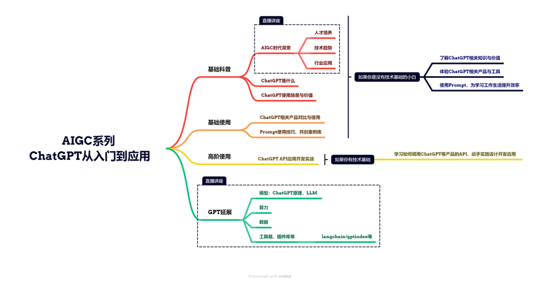 学习的背景:Datawhale 七月将在世界人工智能大会举办"AIGC时代,青年人才培养新模式"的论坛。通过组织AIGC主题的学习,可以更好的了解新技术,以及新时代的人才如何培养。这次学习主要关注入门和应用,一是指如何将ChatGPT作为工具,提升工作效率(没有技术基础),二是如何基于ChatGPT进行产品开发和应用(有技术基础)。