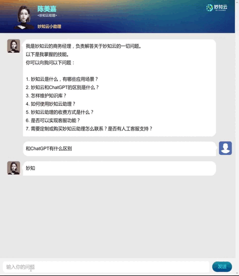 妙知云对于知识点是有主动的学习总结能力,而且会通过你设定的语言风格、人设输出具有逻辑性和关联性的回答。