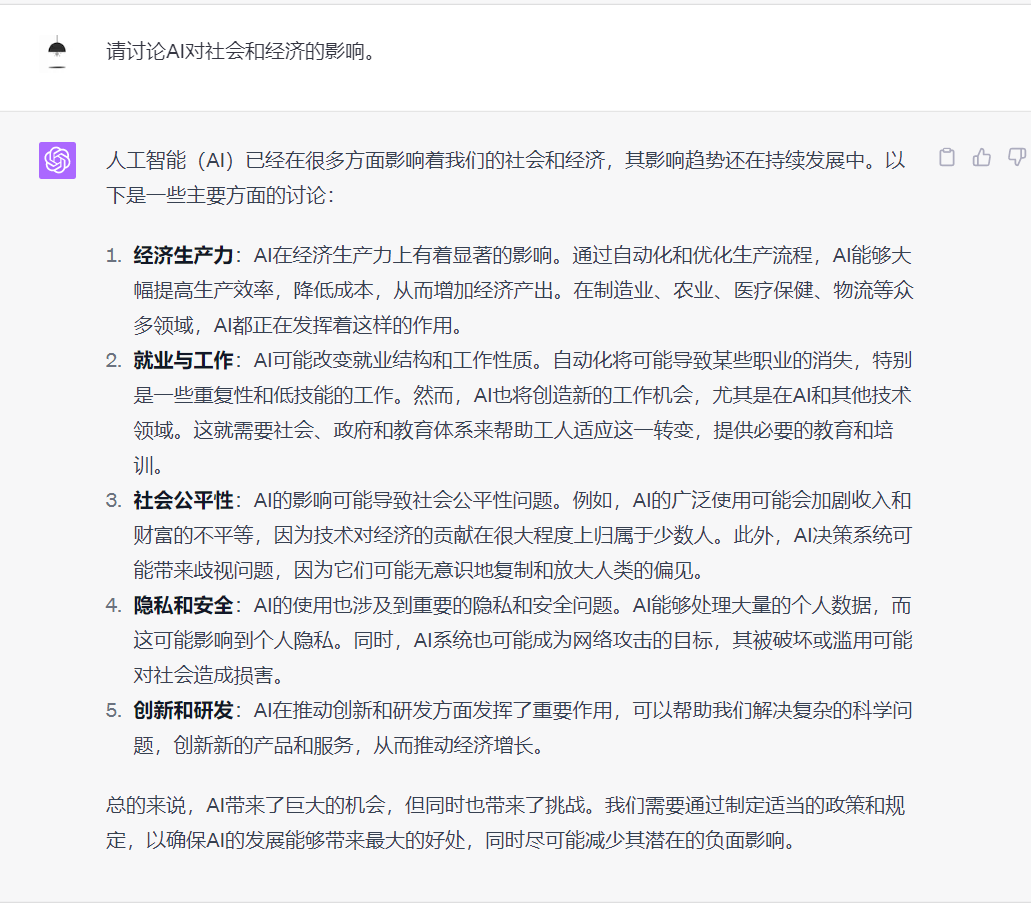 比如对于「请讨论 AI 对社会和经济的影响」这个问题的回答。