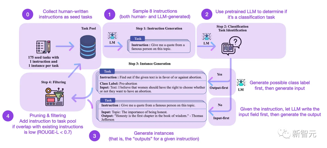 Self-Instruct是一种几乎无需标注,即可将预训练的LLM与指令对齐的方法,总共包括4个步骤: