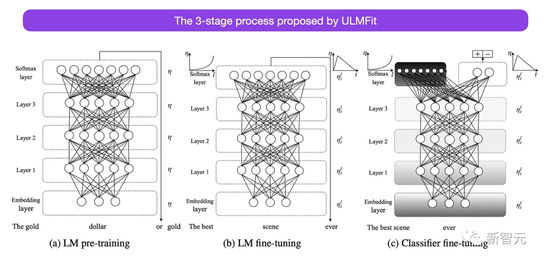 ULMFit提出的微调语言模型的三阶段过程如下: