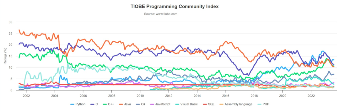 Top 10 编程语言 TIOBE 指数走势(2002-2023)
