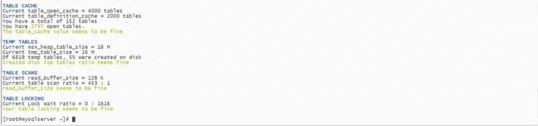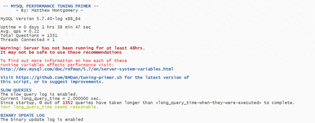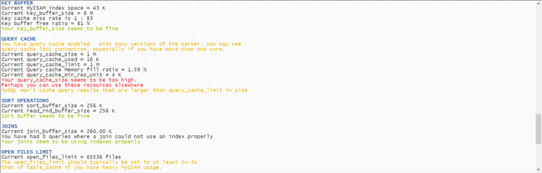 配置评估:tuning-primer.sh会分析MySQL服务器的配置参数,并评估它们的设置。它会检查各个参数的值,并提供有关配置优化的建议。这些建议基于最佳实践和性能优化原则,旨在改善服务器的性能和稳定性。