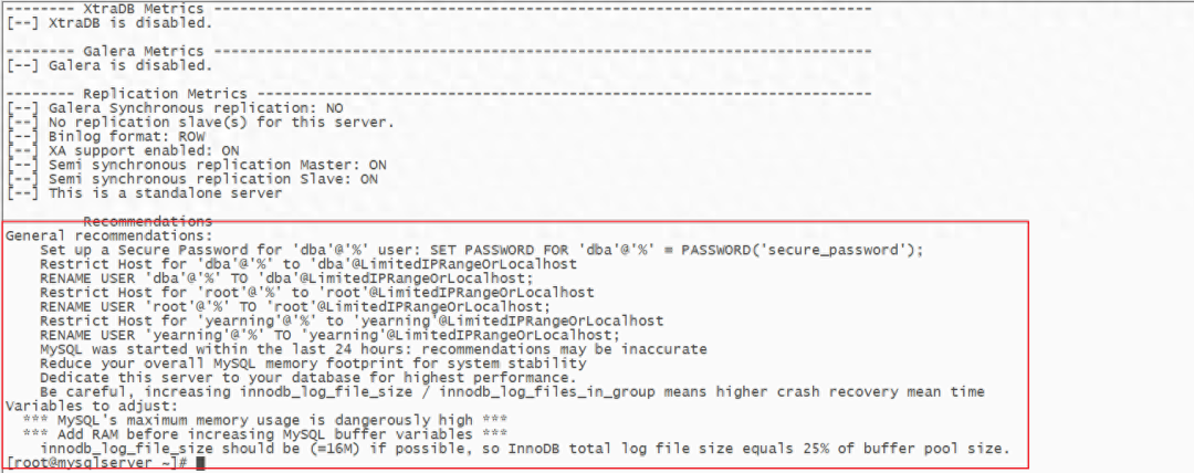 安全建议:mysqltuner.pl还提供有关MySQL服务器安全性的建议。它会检查安全相关的配置参数和权限设置,并给出改进安全性的建议。这有助于确保MySQL服务器的安全性并防止潜在的安全漏洞。