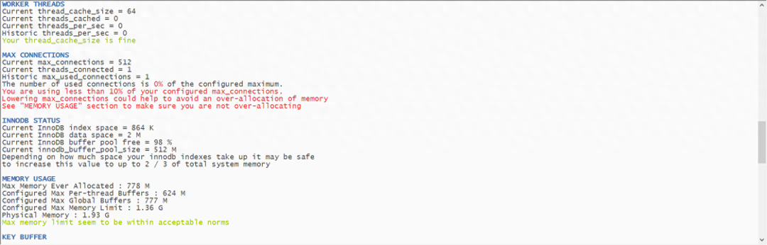 配置建议:mysqltuner.pl会分析MySQL服务器的配置参数,并提供针对这些参数的建议。它会检查各个参数的设置,并根据最佳实践和性能优化原则,给出相应的建议。这些建议可以帮助您优化服务器配置以获得更好的性能和安全性。