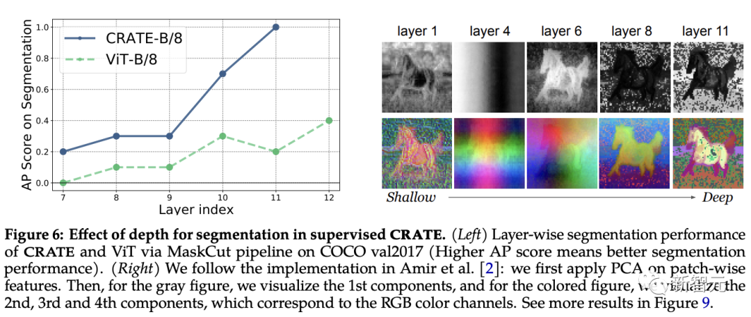 相比之下,即使ViT-B/8的性能在后面的层中略有提高,但其分割分数明显低于CRATE,PCA结果显示,从CRATE深层提取的表征会逐渐更关注前景对象,并且能够捕捉纹理级别的细节。