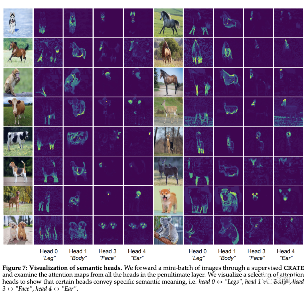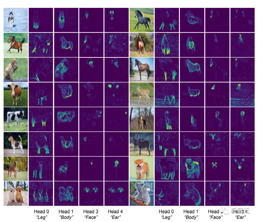 可以发现,每个注意力头都捕捉到了物体的不同部分,甚至不同的语义:例如第一列中显示的注意力头可以捕捉到不同动物的腿,最后一列中显示的注意力头捕捉的是耳朵和头部。