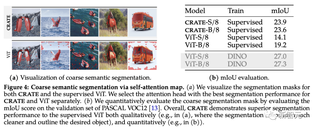 从自注意力图可以看到,CRATE用清晰的边界显式地捕获了对象级的语义,为了定量测量分割的质量,研究人员利用自注意力图生成分割遮罩(segmentation mask),对比其与真实遮罩之间的标准mIoU(平均交并比)。