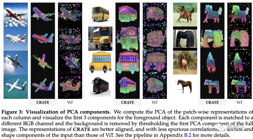 遵循之前关于可视化图像学习的逐块深度特征的工作,研究人员对CRATE和ViT模型的深度token表征进行主成分分析(PCA)研究。
