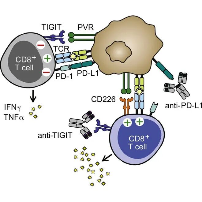TIGIT是一种在肿瘤浸润淋巴细胞中高表达的共抑制受体,这些淋巴细胞包括效应和调节CD4+ T细胞、效应CD8+ T细胞以及NK细胞。TIGIT与其同源配体PVR的结合直接抑制淋巴细胞激活。TIGIT和PVR广泛表达在不同类型的实体瘤中,说明TIGIT-PVR信号通路可能是一种主要的肿瘤免疫逃逸机制,是继PD-1/PD-L1之后的新型免疫检查点。