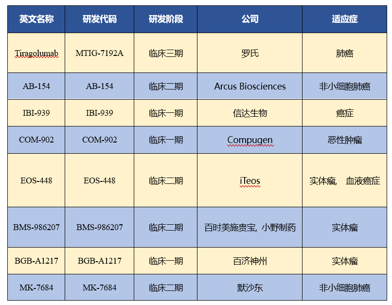 基于以上的机理,TIGIT靶点也一直有下一代免疫检查位点抑制剂新贵之说,不少企业也开始涉及该靶点的药物研发,尤其以罗氏的投入力度最大。同时阻断TIGIT与PD-L1/PD-1可能产生协同抑制肿瘤的作用,罗氏也开始不断探索TIGIT抑制剂与泰圣奇的联用。