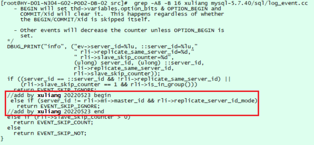 修改 log_event.cc 文件的 Log_event::do_shall_skip 函数,判断当前 event 的 server_id 和本通道对端主库 master 的 server_id 不相同时忽略,仅同步对端主库产生的 event,避免多通道主主时数据回路的问题。