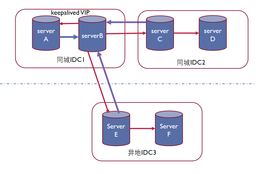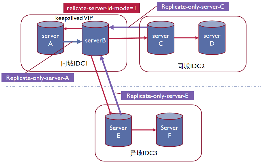 为解决复制回路问题,在主机房边界节点实例上,本方案使用上文中根据对端主库 server id 判断是否和 event 的 server id 相同,对 IDC1 边界 MySQL 复制逻辑进行限制,只同步管道内临近主产生的 binlog 日志,级联主日志丢弃,1 个同步管道只同步单台 master 日志,解决回路问题。其他节点无需开启这个功能。