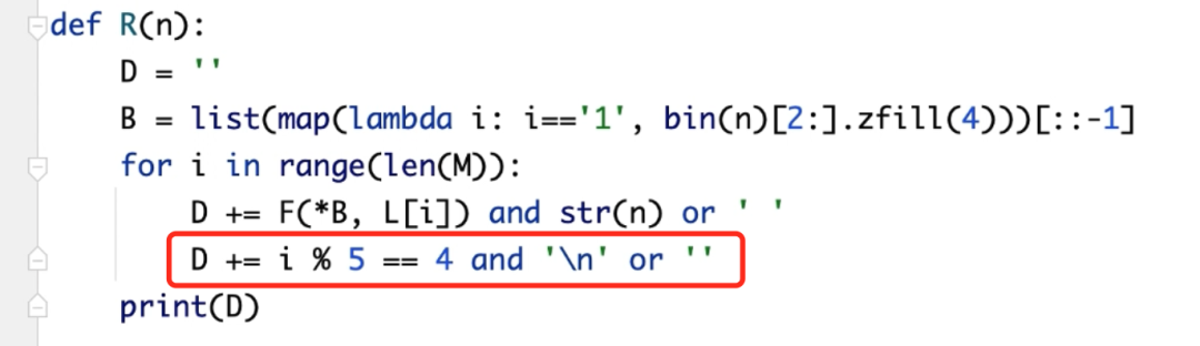 D += (i % 5 != 4 and [''] or ['\n'])[0]