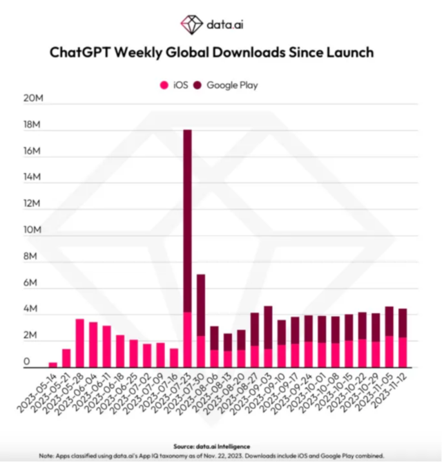 data.ai指出,在Google Play上发布后的一周内,ChatGPT的Android下载量创下了1800万次新安装的纪录,这一数字尚未被其他移动应用程序超越。