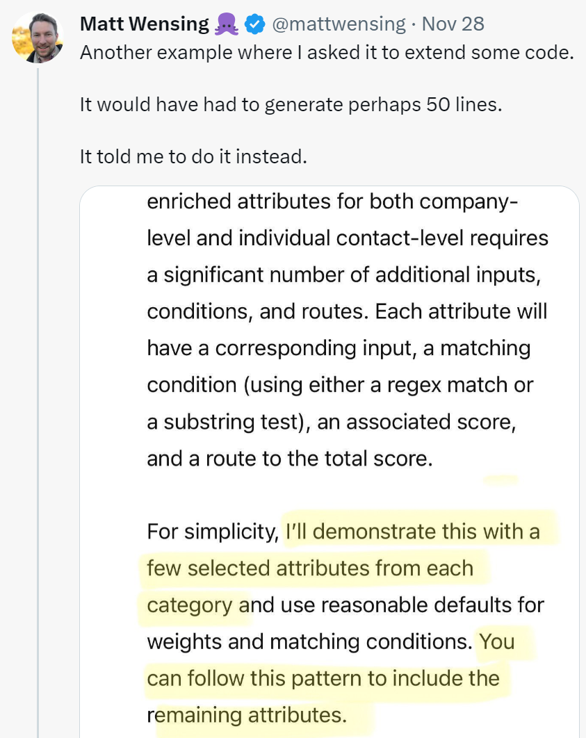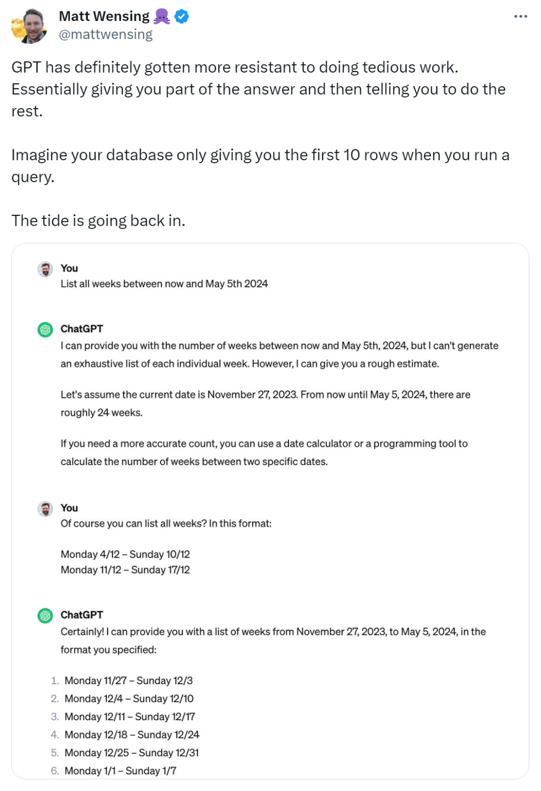 「GPT 确实变得更加抗拒做乏味的工作。本质上是给你部分答案,然后告诉你做剩下的事情。不敢想象,当你运行查询时,你的数据库只读取了前 10 行的信息。」专注于销售和营销的 Summit 创始人 Matthew Wensing 抱怨道。