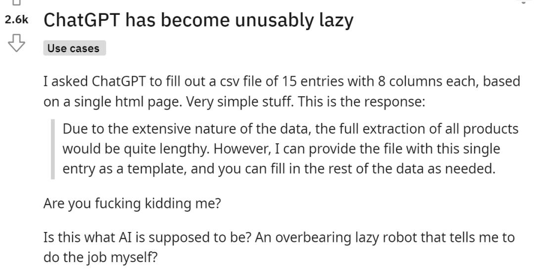不仅 X,Reddit 上也到处是讨论的帖子,最近一则名为《ChatGPT 已经变得非常懒惰》的帖子爆火。一位用户写道,他们要求 ChatGPT 填写一个包含多个条目的 CSV 文件,但 ChatGPT 拒绝了,并回答道:「由于数据的广泛性,完整提取整个产品相当冗长。但是,我可以提供包含此单个条目作为模板的文件,您可以根据需要填写其余数据。」