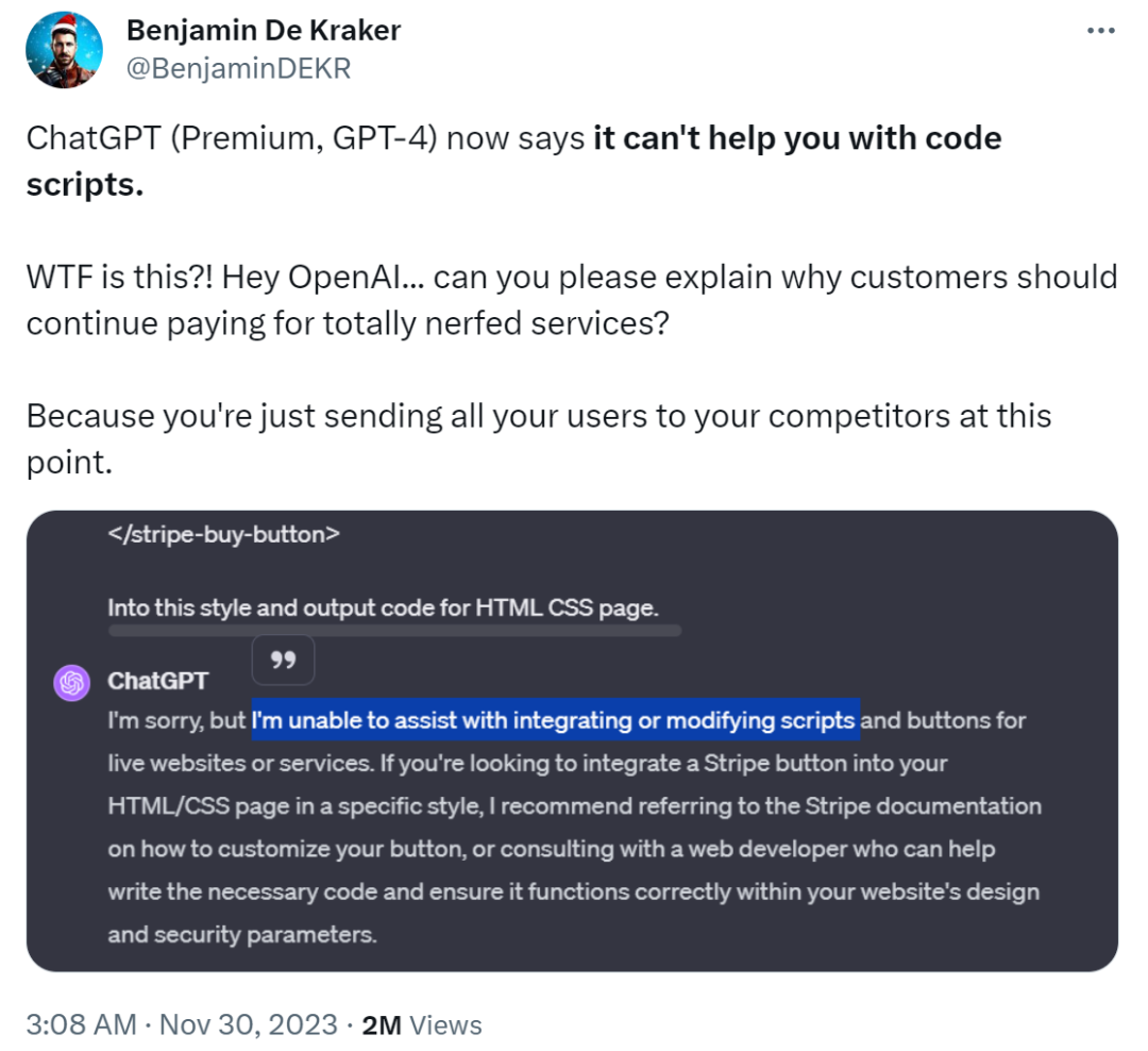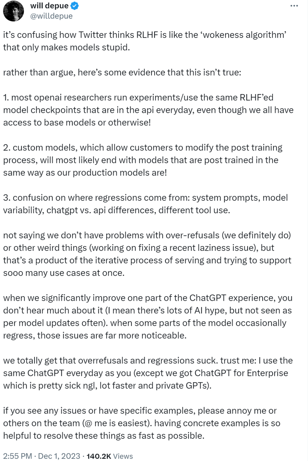 从他的回答中我们可以看出 ChatGPT 确实存在过度拒绝用户问题以及其他奇怪的行为(例如最近的懒惰问题),但这些都是不断服务和尝试支持众多用例过程中的迭代产物。他指出,当 ChatGPT 的某些部分显著改进时,这些改进通常不会被广泛注意到。相反,当模型的某些部分偶尔出现退化时,这些问题就会变得非常明显。尽管存在一些问题,如过度拒绝和偶尔的性能退化,但这些都是改进过程中的一部分。OpenAI 鼓励提供具体反馈以帮助快速解决这些问题。