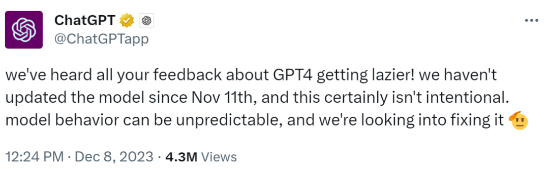 对于这个问题,ChatGPT 官方账户发布了推文,OpenAI 承认了这个问题,但不确定是什么原因造成的。「我们已收到您关于 GPT4 变得更加懒惰的所有反馈!自 11 月 11 日以来我们就没有更新过模型,这当然不是故意的。模型行为可能是不可预测的,我们正在研究修复它。」