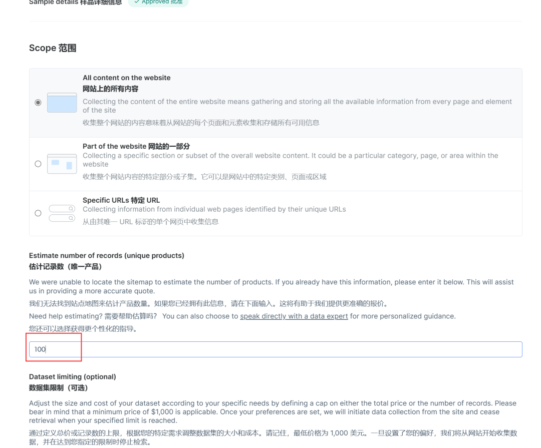 接下来你还可以对数据量进行一个调整,比方说抓取多少条数据,这里设置为100,如下图所示: