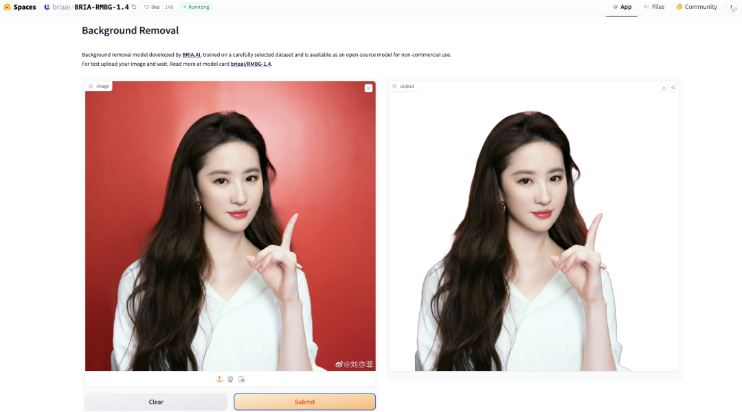 如果想快速体验,你也可以直接使用huggingface上搭建的demo:https://huggingface.co/spaces/briaai/BRIA-RMBG-1.4。用一张神仙姐姐的照片测试,效果还是刚刚的: