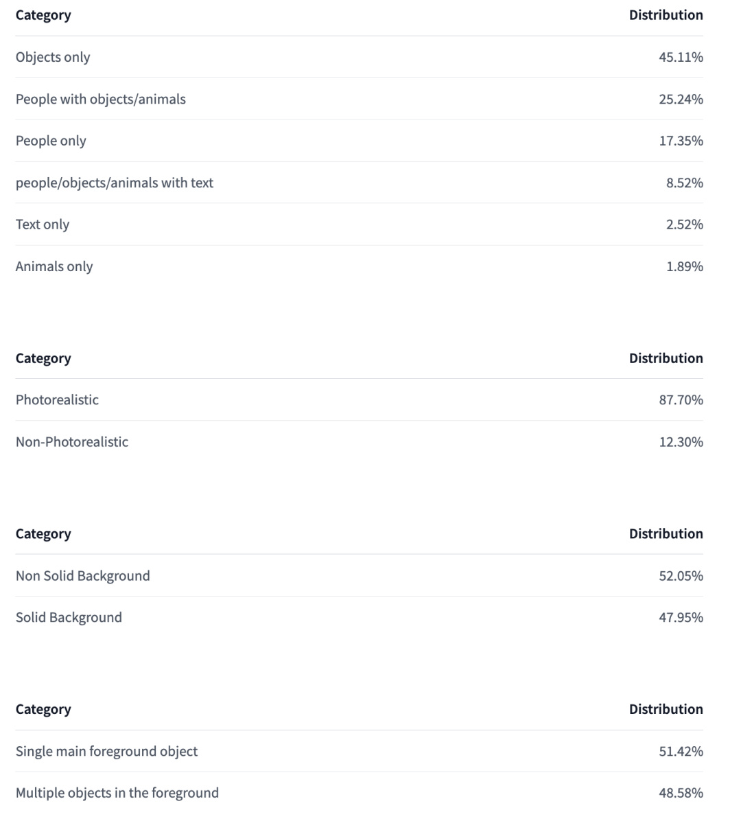 具体来说,这个模型使用超过 12,000 张高质量、高分辨率、手动标记(像素精度)、完全许可的图像进行训练。为了让模型有足够的泛化性,训练数据集包含各种类别的图片,下面是具体的数据类别分布: